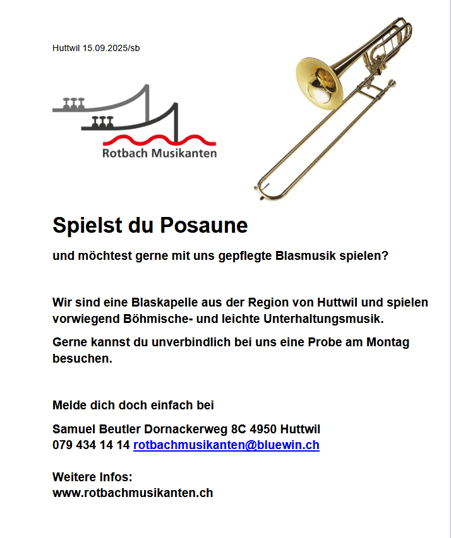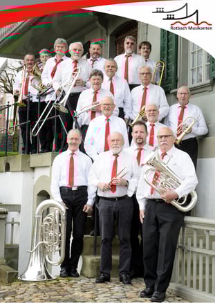 Die Rotbach – Musikanten, vorwiegend Bläser aus der Region Huttwil, wurden im Februar 2017 gegründet und proben zweimal pro Monat im Schulhaus Oeschenbach. Unter der musikalischen Leitung von Alfred Hänni, Muhen AG, spielen wir vor allem Egerländer Sound sowie Literatur von Schweizer Komponisten. Swing, Rag, Tango, Evergreens gehören nebst Marsch, Walzer und Polka zum vielseitigen Repertoire. Die Rotbach – Musikanten können engagiert werden, sei es für Firmenanlässe, Geburtstage, in Heimen, sowie bei anderen vielseitigen Events. Nehmen Sie mit uns Kontakt auf.